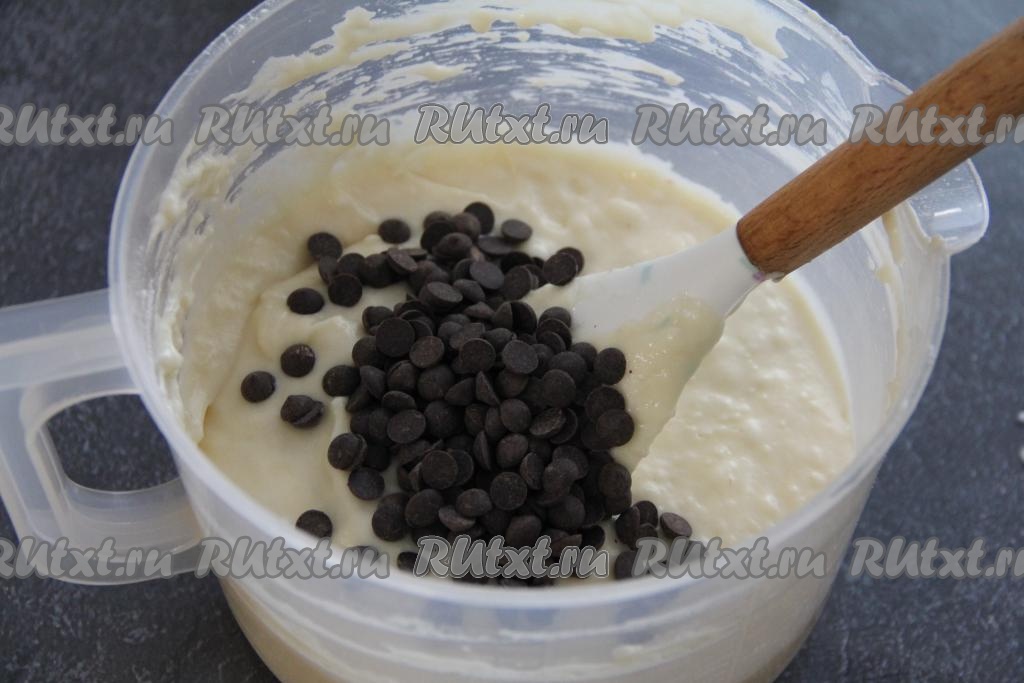 По желанию, можно добавить в тесто шоколадные капли. Аккуратно вмешать кусочки шоколада в тесто.