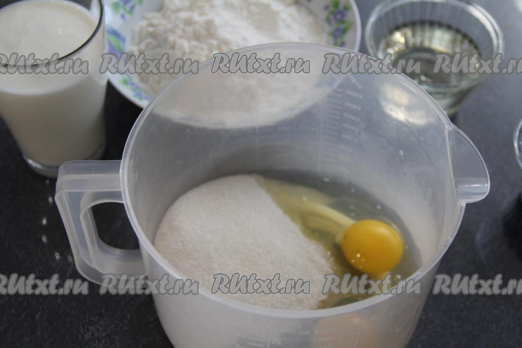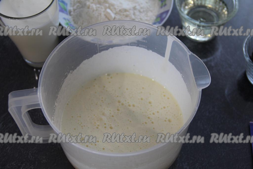 В яйца, взбитые с сахаром, влить кефир и растительное масло, взбить миксером. Всыпать просеянную муку и разрыхлитель.