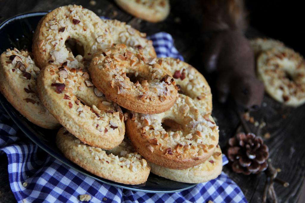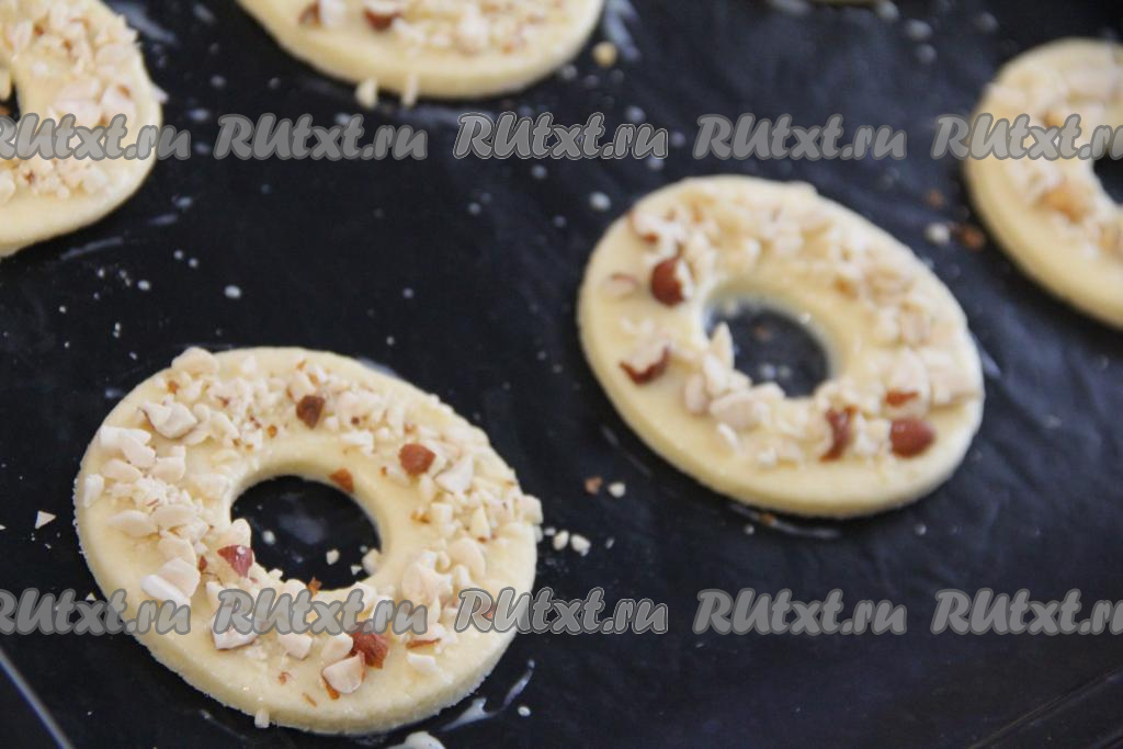 Переложить колечки на противень, застеленный ковриком (или пергаментом для выпечки). Смазать верх колечек взбитым желтком. Орехи порубить ножом и посыпать орешками песочные колечки.