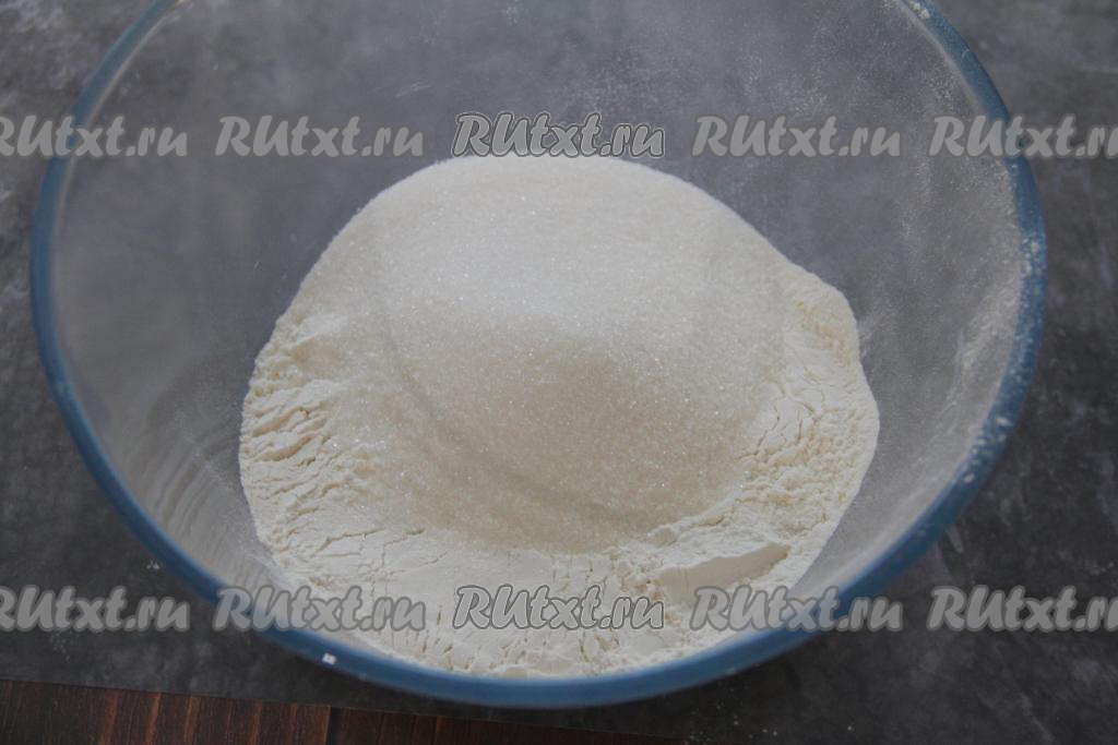 В глубокую миску всыпать 250 грамм муки, ванильный сахар, разрыхлитель и сахар, перемешать сахарно-мучную смесь.