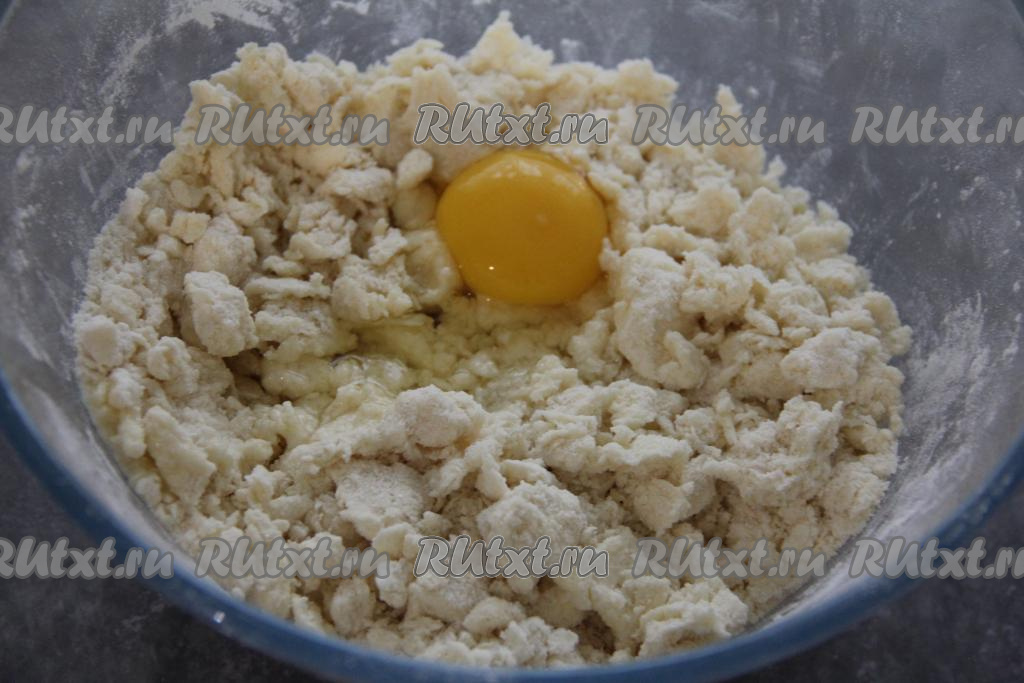 Перетереть содержимое миски руками до получения крошки. В получившуюся крошку добавить сырое яйцо.