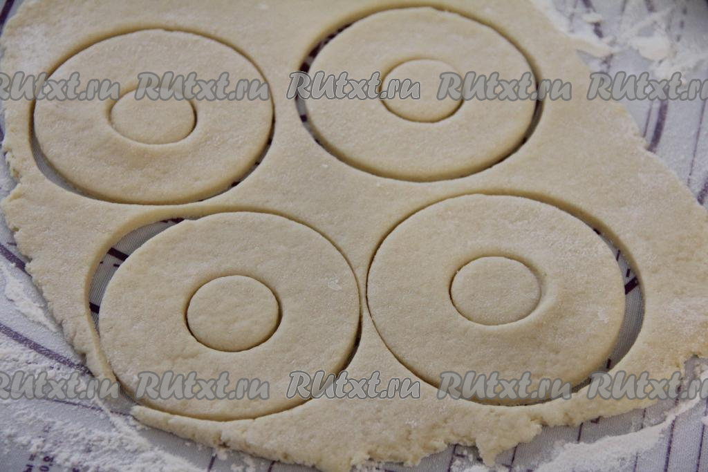 Отдохнувшее тесто на присыпанной мукой поверхности раскатать в пласт толщиной примерно 1 сантиметр. Вырезать колечки любого диаметра (у меня колечки диаметром 10 сантиметров). Большие колечки удобно вырезать кружкой, а маленькие колечки - пробкой от пластиковой бутылки.