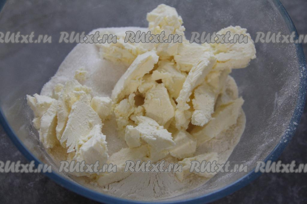 Нарезать на кусочки хорошо охлаждённое (из холодильника) сливочное масло, сразу добавить его в миску с сахарно-мучной смесью.