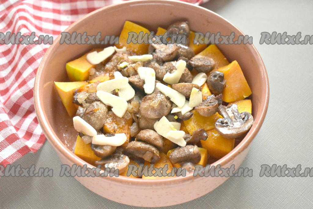 Солим тыкву с шампиньонами и луком, перчим по вкусу. Добавляем очищенные и нарезанные на пластинки зубчики чеснока.