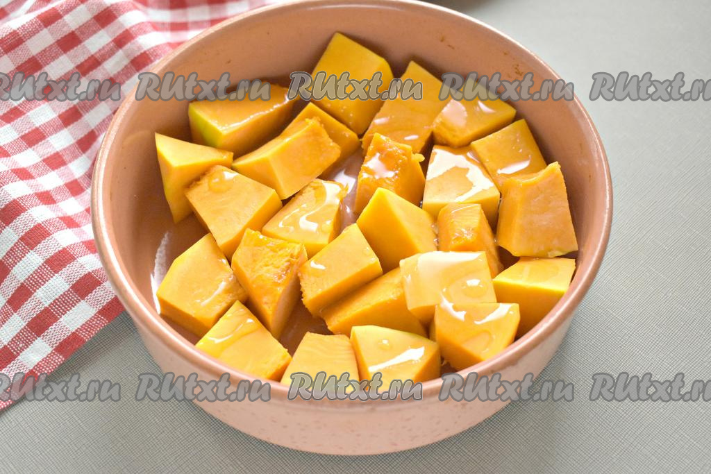 Кусочки тыквы перекладываем в жаропрочную форму и сбрызгиваем 1 столовой ложкой растительного масла. Ставим форму с тыквой в разогретую до 200 градусов духовку на 20 минут.