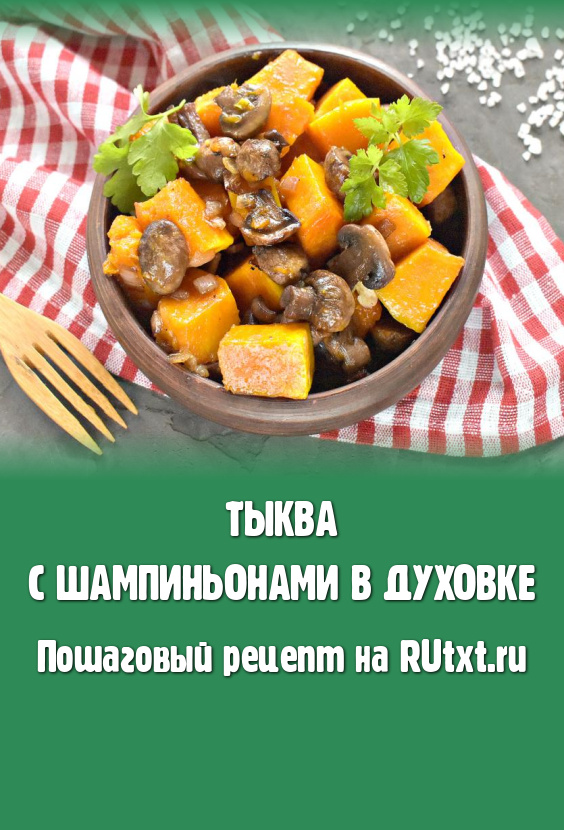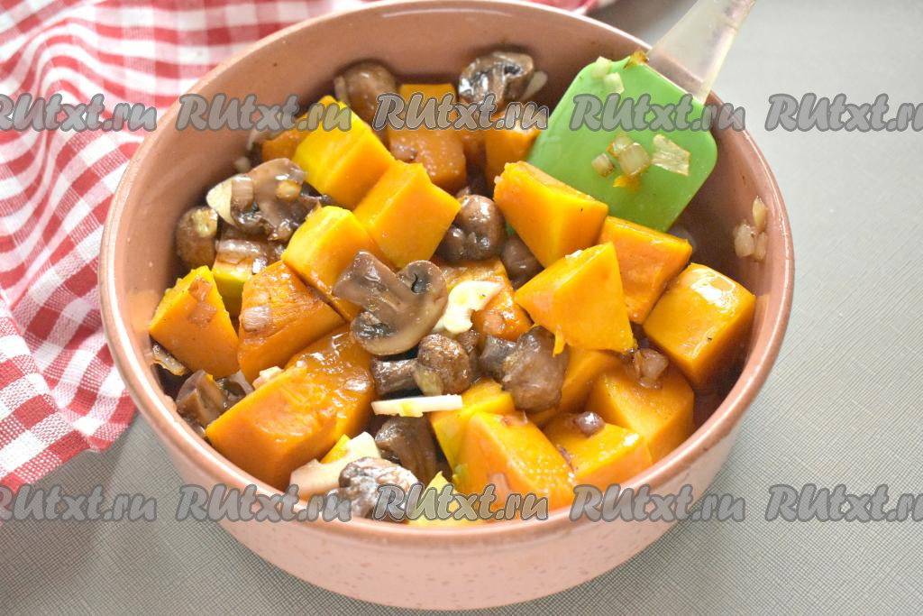 Перемешиваем и снова ставим форму в духовку. При той же температуре запекаем тыкву с грибами 10 минут (готовая тыква должна стать достаточно мягкой, она будет легко прокалываться ножом), выключаем духовку. Но форму с тыквой и шампиньонами оставляем в закрытой духовке ещё на 10 минут.