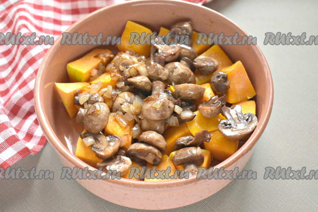 После того как тыква пропечётся в течение 20 минут, добавляем шампиньоны с луком.