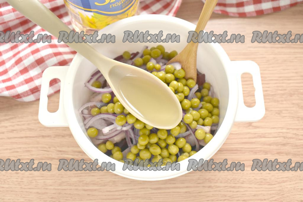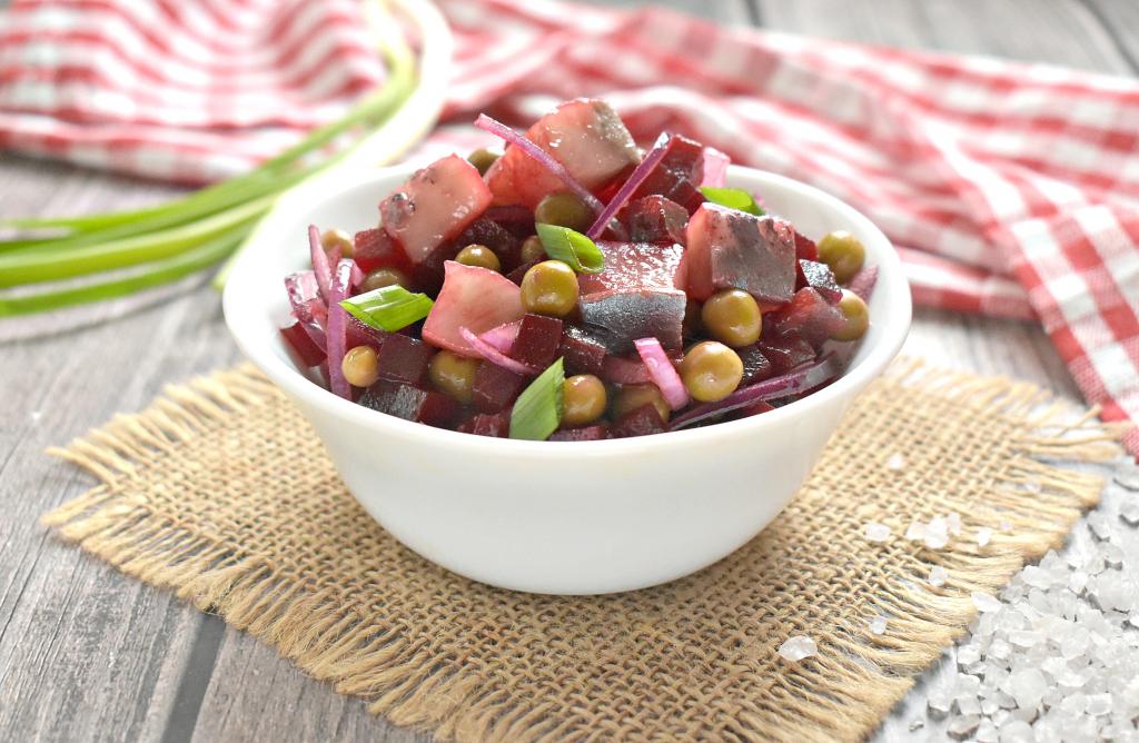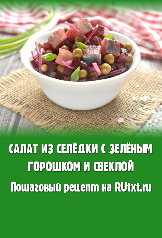 Салат, приготовленный из селёдки с зелёным горошком и свеклой, получился вкусным, аппетитным и сытным. Перед подачей его можно украсить нарезанной зеленью (я посыпала зелёным луком). Угощайтесь!