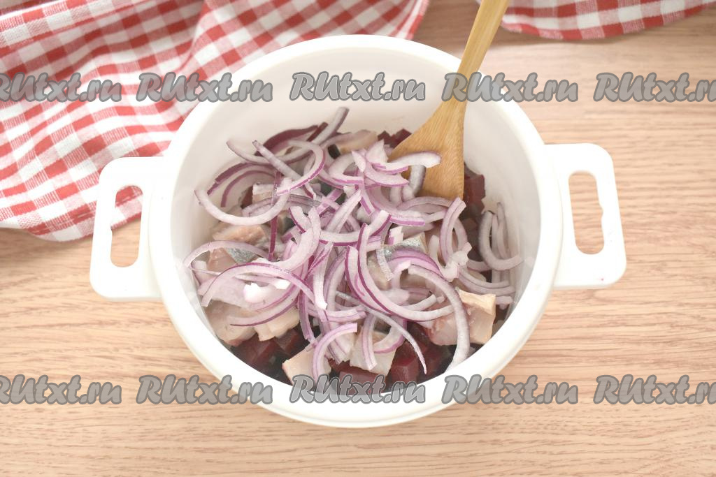 Нарезаем половину очищенной луковицы на тонкие полукольца и добавляем к сельди со свеклой.