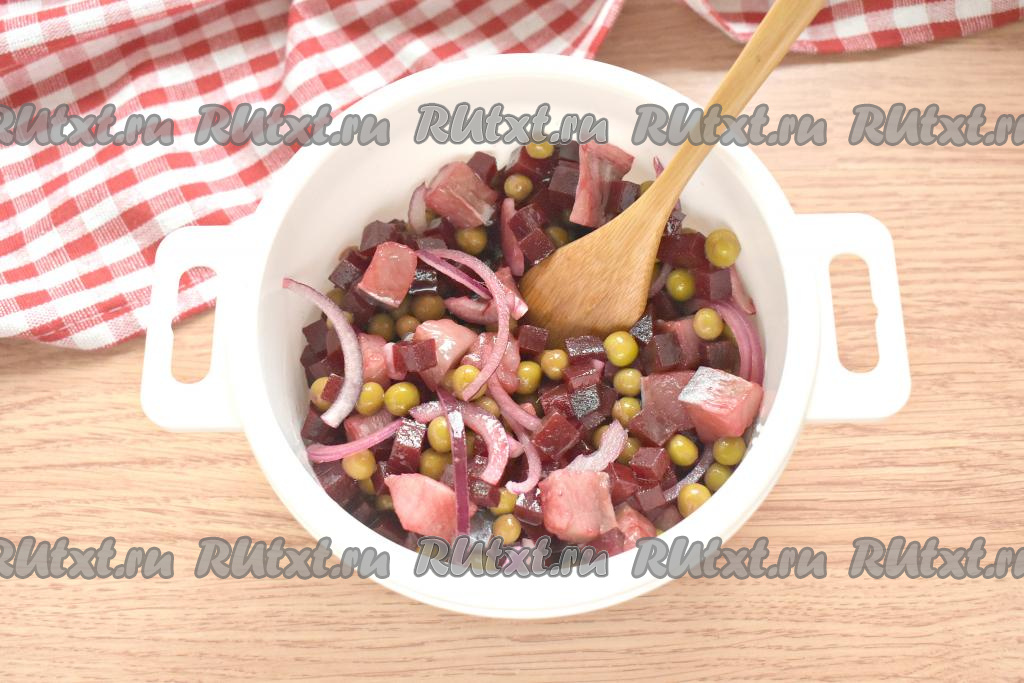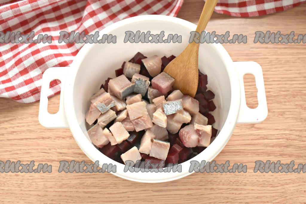 Филе солёной сельди, тщательно очищенное от косточек, нарезаем на кубики чуть большего размера, чем нарезана свекла. Селёдку отправляем к свекле.