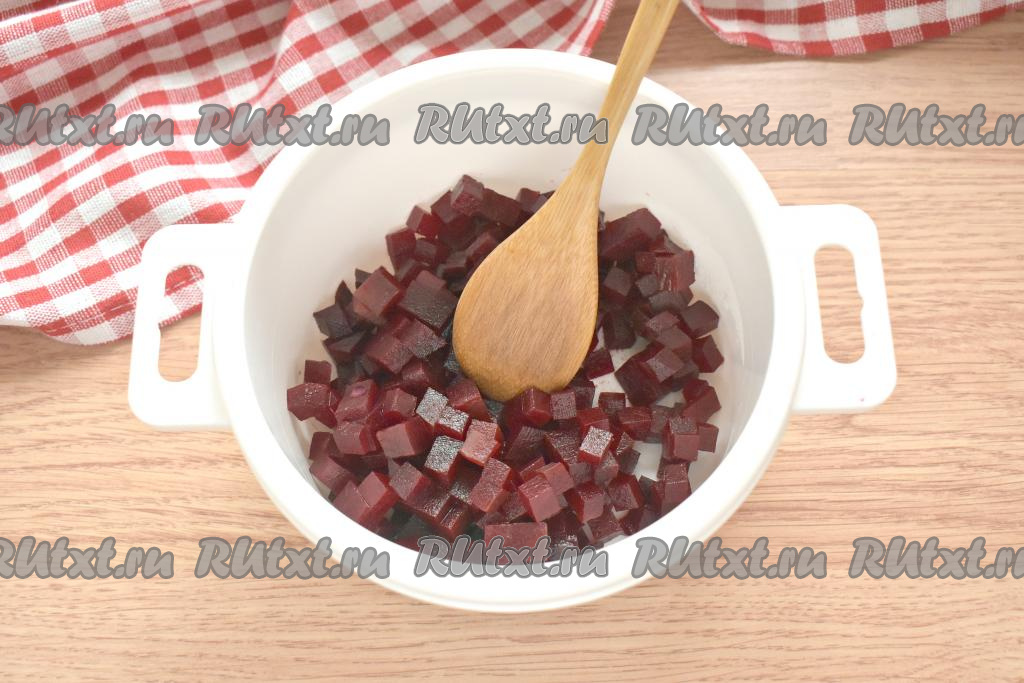 Свеклу нужно заранее, не снимая кожуру, отварить в воде до готовности (на отваривание, в зависимости от сорта свеклы, может потребоваться от 45 до 60 минут). Варёную свеклу остужаем, поместив её под холодную воду, а затем очищаем от кожуры. Нарезаем очищенную свеклу на маленькие кубики и перекладываем в миску.