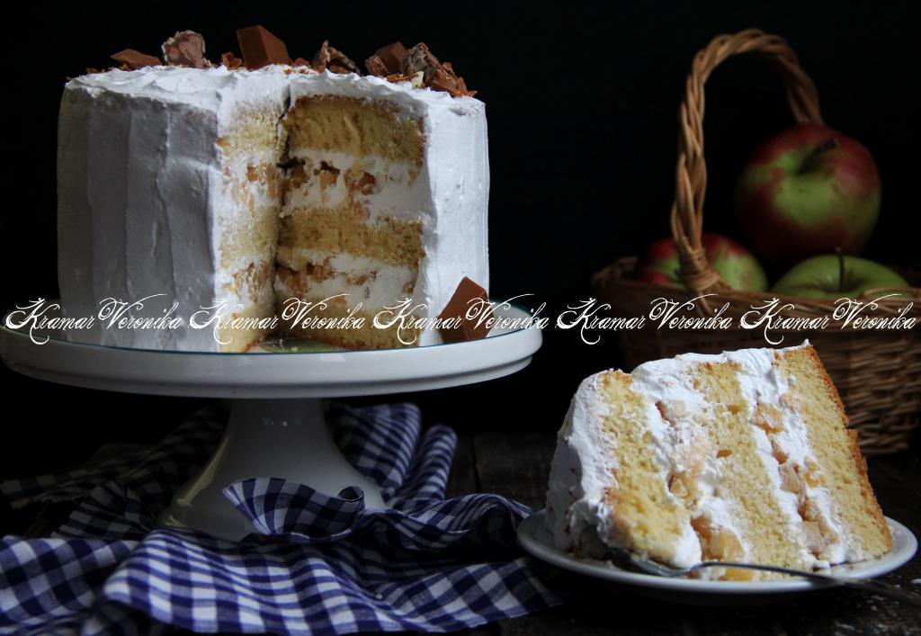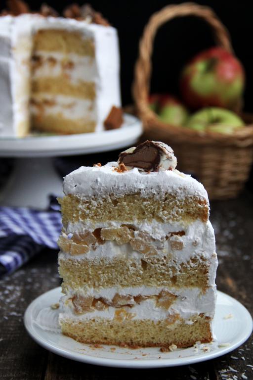 Сверху разместить второй корж, пропитать молоком, выложить часть крема и яблочную начинку. Накрыть третьим коржом. Поставить торт в холодильник на ночь. Оставшийся крем из взбитых сливок тоже поставить в холодильник. На следующий день верх и бока готового торта "Шарлотка" с яблоками покрыть оставшимся кремом и украсить по желанию.