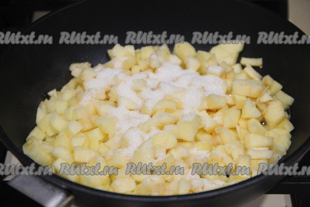Пока бисквит отдыхает, приготовить яблочную начинку. Для этого нужно яблоки, очищенные от кожуры и семечек, нарезать на мелкие кубики. В сковороду выложить сливочное масло, яблоки, всыпать ванильный и обычный сахар.