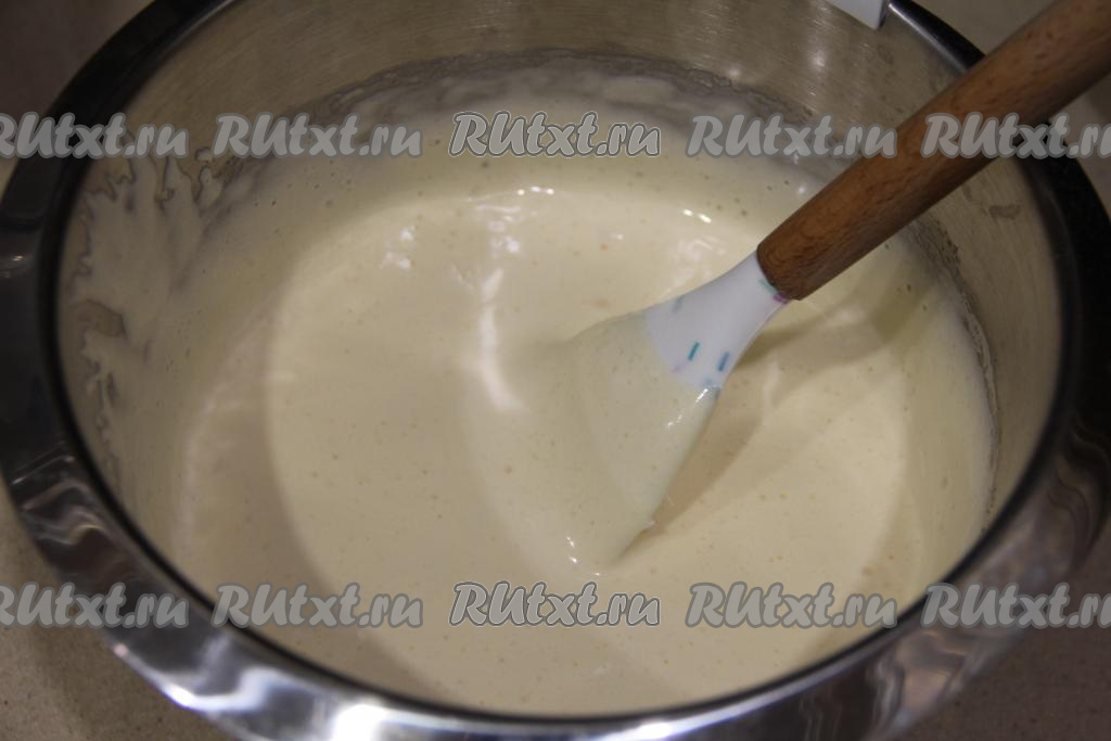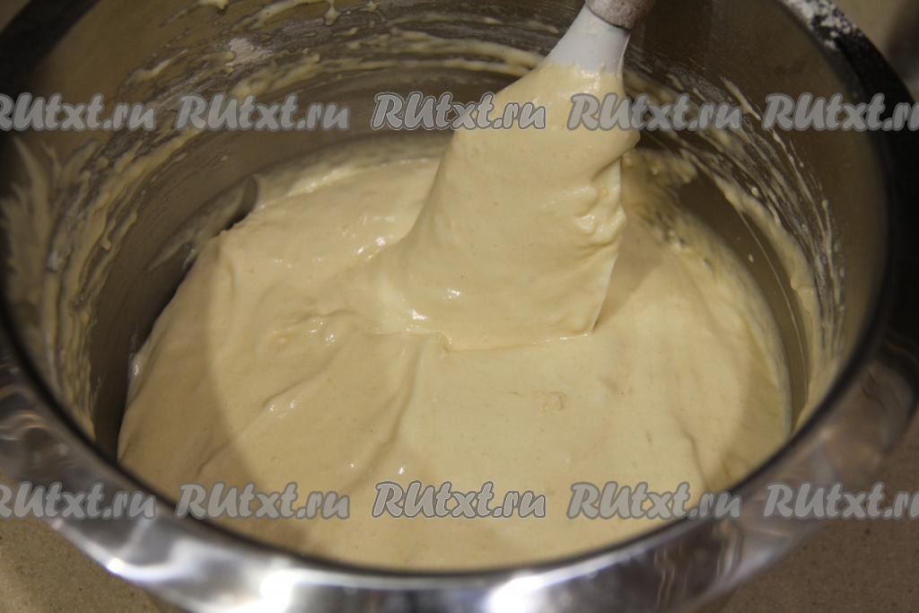 В пышную яичную смесь всыпать просеянную муку и разрыхлитель, перемешивать тесто движениями снизу вверх с помощью лопатки. Тесто для бисквита должно получиться однородным, воздушным, не очень густым.
