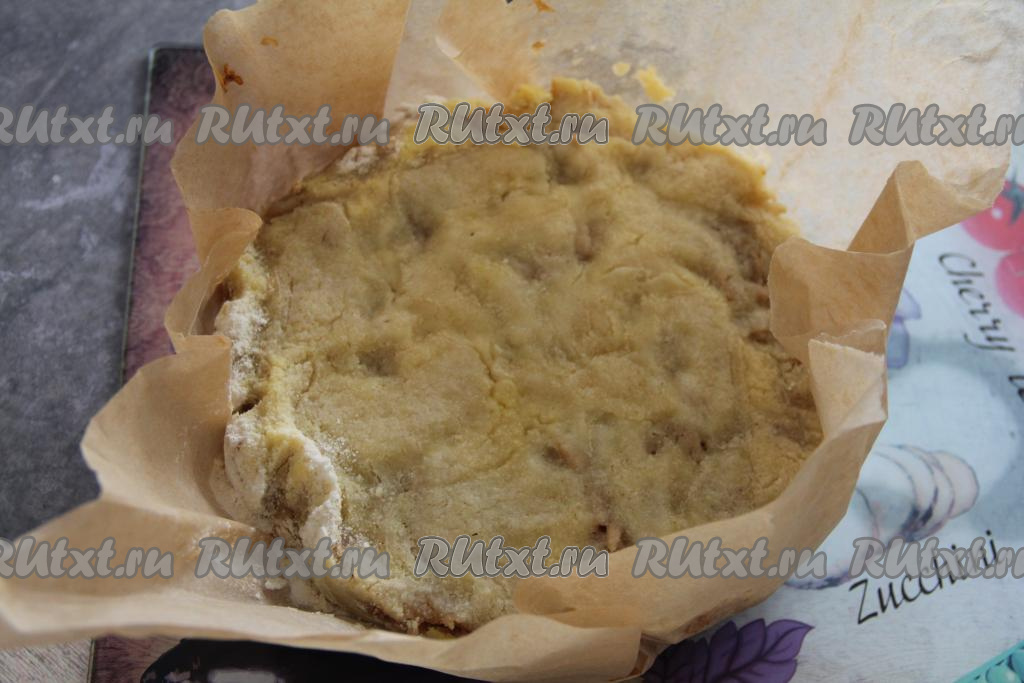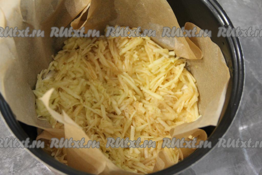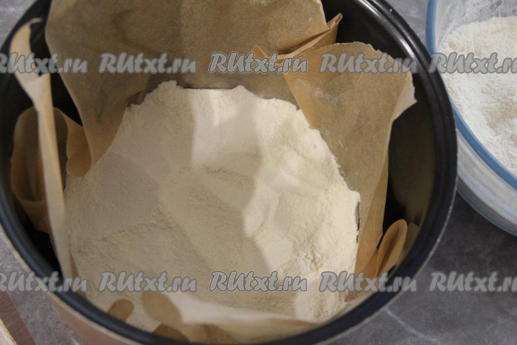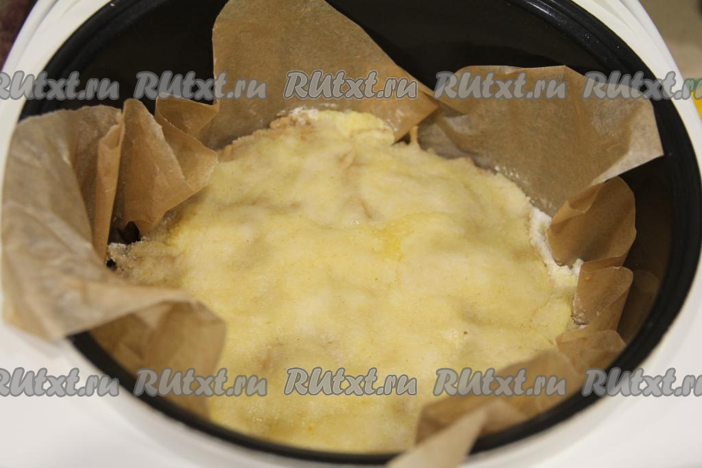Чашу мультиварки выстелить пергаментом. Выложить треть смеси сухих ингредиентов на дно застеленной чаши мультиварки.