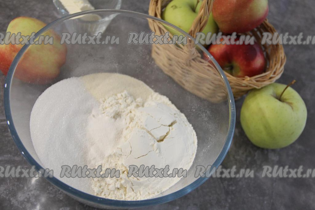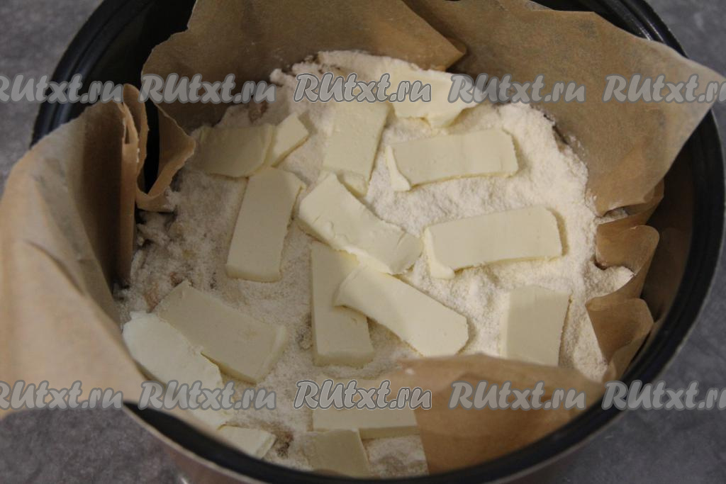 Выложить ещё одну часть смеси сухих ингредиентов, сверху равномерно разложить оставшиеся натёртые яблоки. Выложить третий слой сухих ингредиентов, сверху разложить тонкие кусочки сливочного масла.