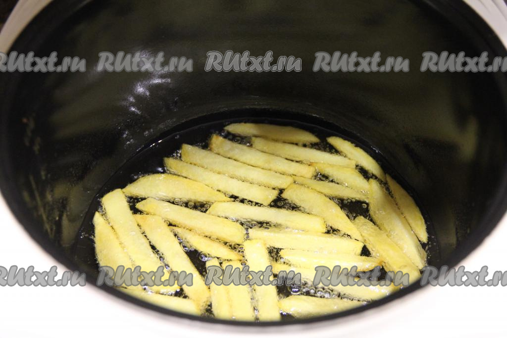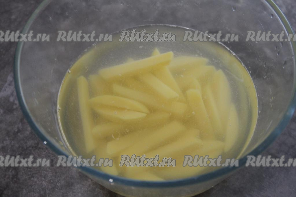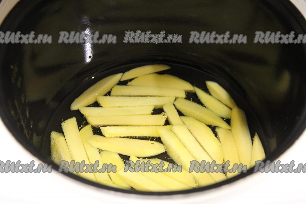 Картошку почистить, нарезать на брусочки и замочить в ледяной воде на 10 минут. Холодная вода удалит крахмал из картошки и она не будет приставать к чаше мультиварки во время жарки во фритюре.