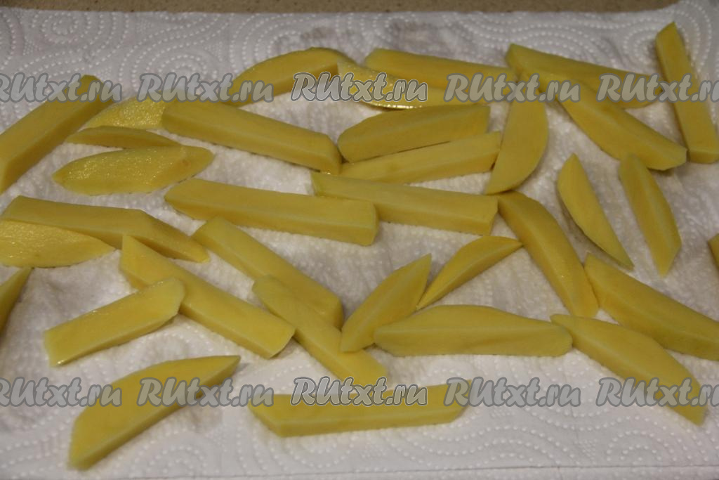 Обсушить картошку бумажным полотенцем. Лишней воды быть не должно, так как вода, соприкасаясь с нагретым маслом, вызывает брызги масла.