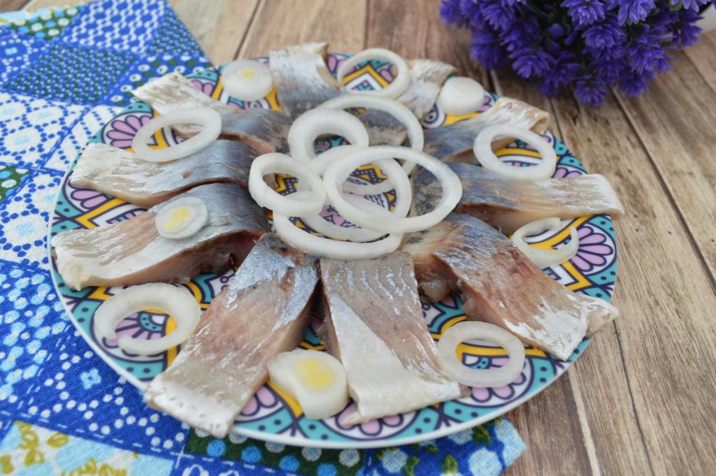 Через сутки достаём рыбку, аккуратно снимаем кожу, нарезаем на кусочки и подаём к столу. Я подала вместе с колечками репчатого лука, очень аппетитно выглядит. Селёдка получается малосольной, очень нежной и вкусной, а готовится в домашних условиях всего за 24 часа.
