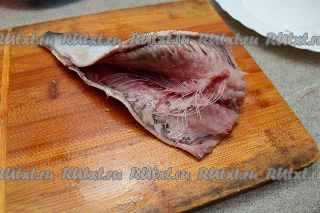Продолжить разрез по брюшку до хвоста и аккуратно вынуть основную хребтовую кость и все достаточные крупные косточки (чем больше костей вы удалите, тем удобнее будет кушать малосольную селёдку).