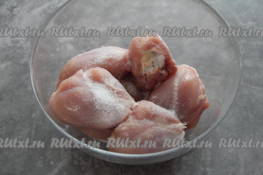 Я предварительно у куриных ножек отрубила часть кости с хрящом, на которой нет мяса, а затем с подготовленных ножек сняла кожу, но это делать необязательно. Куриные ножки промыть водой, обсушить их, а затем выложить в миску, посолить по вкусу, втерев соль в мясо.