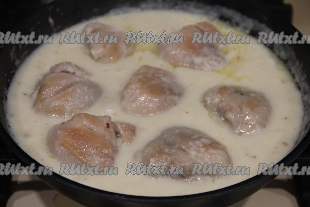 Обжаренные куриные ножки выложить в сковороду с молочным соусом, дать закипеть, убавить огонь до минимума, накрыть сковороду крышкой и готовить 25 минут (1-2 раза за это время ножки можно перевернуть с одной стороны на другую, чтобы мясо равномерно пропиталось молоком).