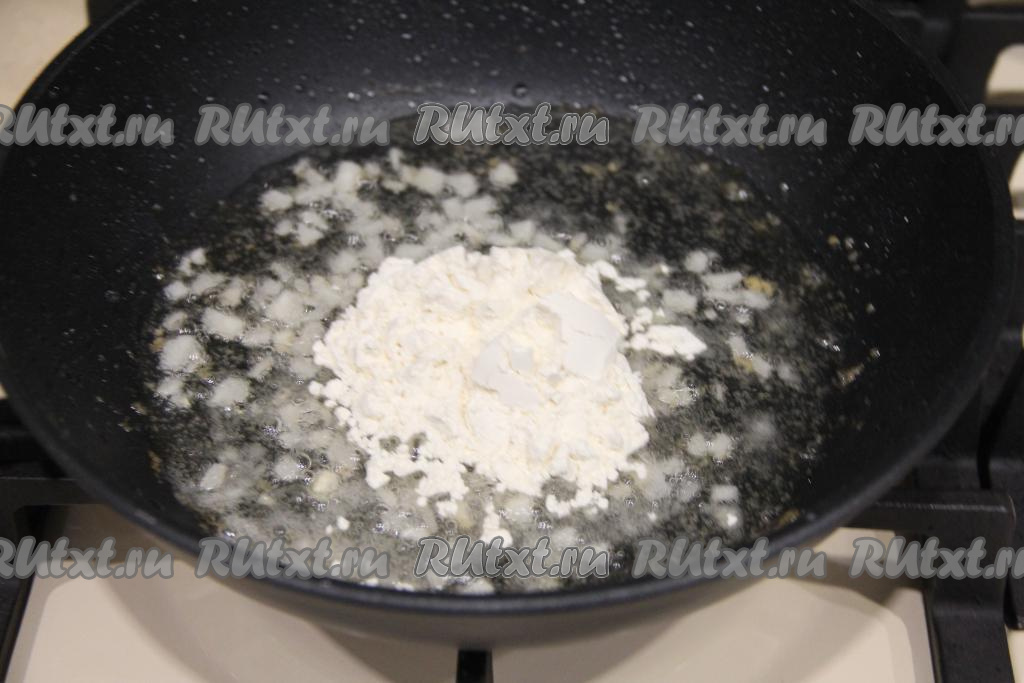 Затем всыпать в сковороду муку и быстро обжарить, перемешивая лопаткой, до кремового цвета.