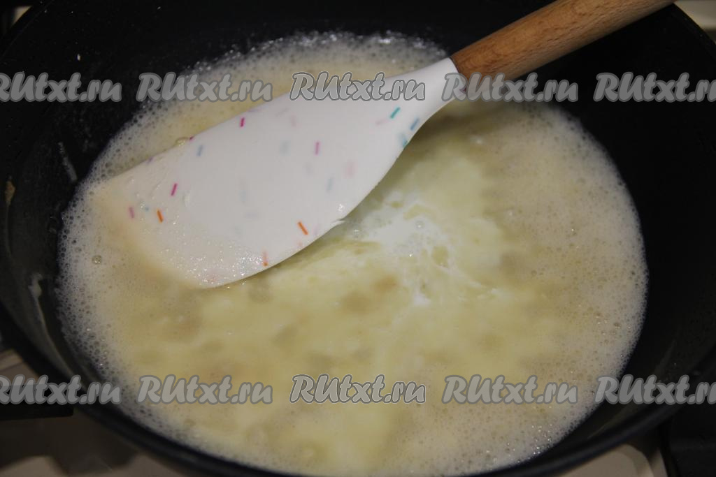 К обжаренной муке влить тонкой струйкой молоко, непрерывно и интенсивно перемешивая.