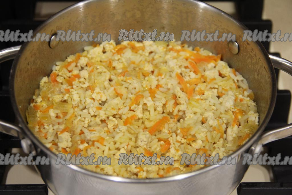 В кастрюлю с фаршем, рисом и овощами влить 360 миллилитров горячей воды (вода должна быть выше уровня риса на 2 сантиметра). Поставить на огонь и довести до кипения. Накрыть кастрюлю крышкой и варить рисовую кашу с фаршем на минимальном огне до полного испарения воды (около 30 минут).
