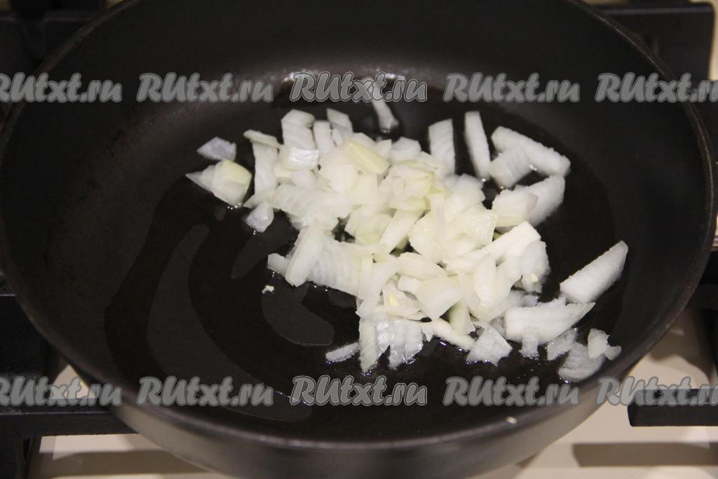 В сковороду влить растительное масло, выложить мелко нарезанную луковицу, обжаривать на среднем огне минуты 3-4 (до прозрачности), периодически помешивая.