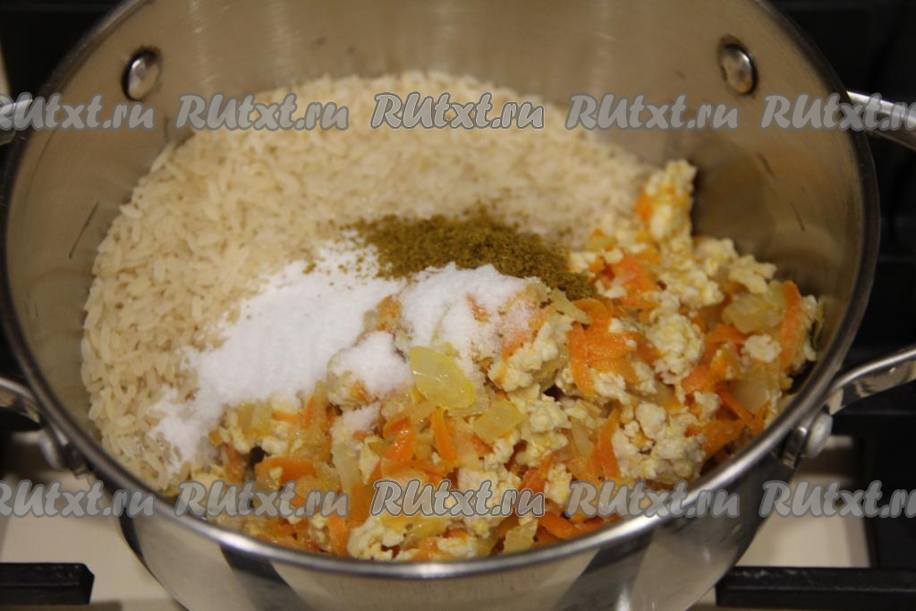 В кастрюлю всыпать сухой рис (я предварительно рис не промывала). Добавить обжаренные овощи и фарш.