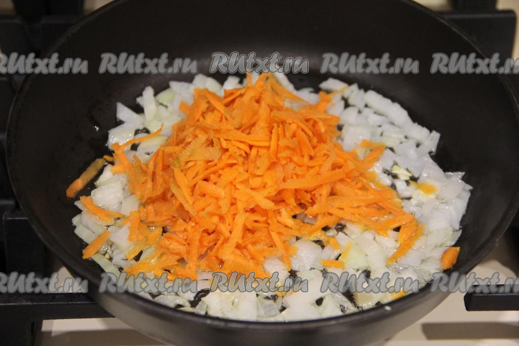 Затем выложить в сковороду натёртую на крупной тёрке морковку, перемешать.