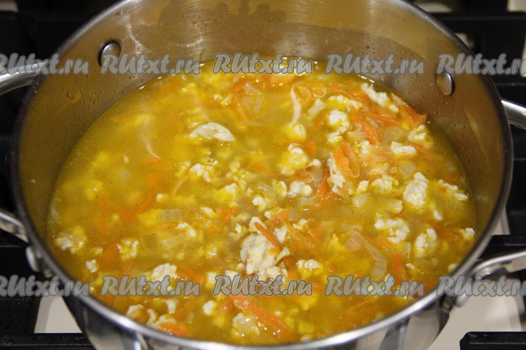 Обжаривать фарш с овощами 10-12 минут, периодически разбивая комочки мяса.