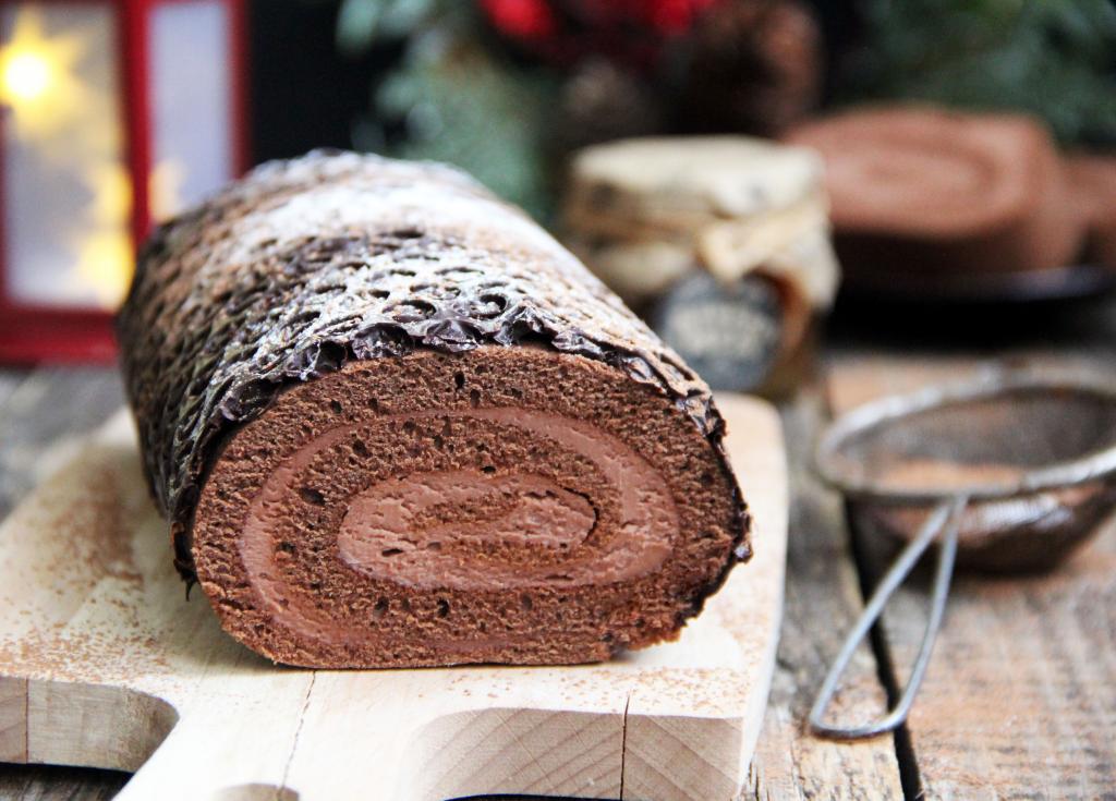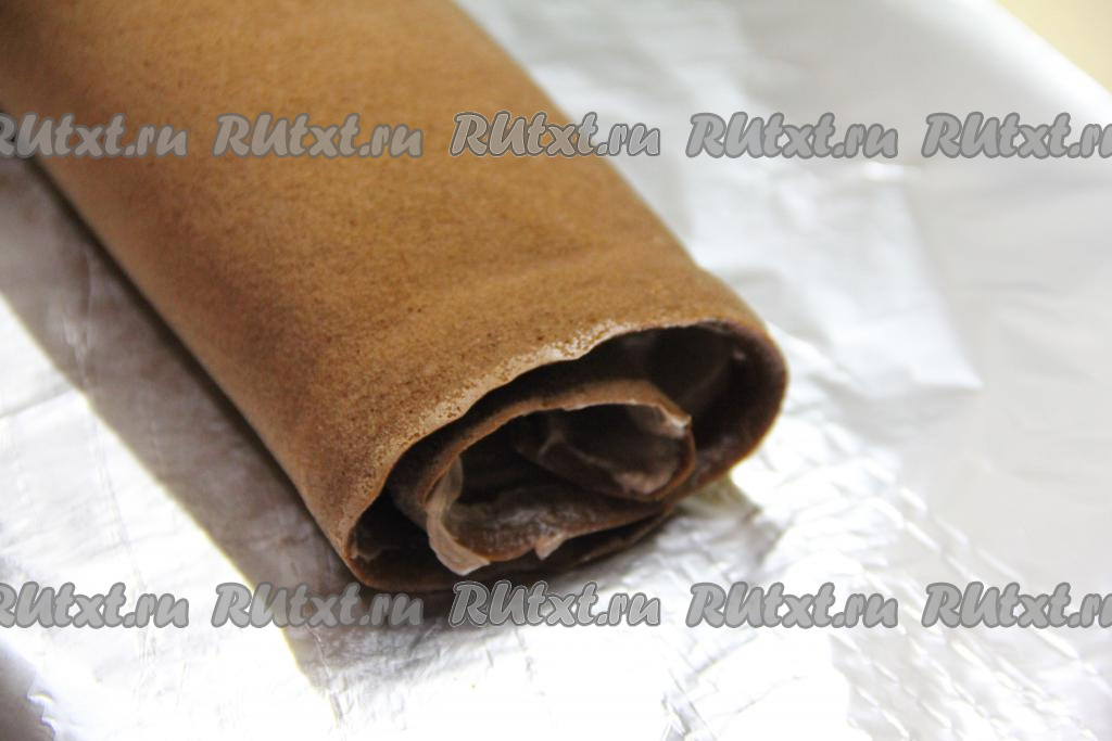 Свернуть бисквит с шоколадным кремом в плотный рулет, начиная с широкой стороны коржа. Завернуть медово-шоколадный рулет в фольгу и поместить в холодильник на ночь, чтобы он как следует пропитался.