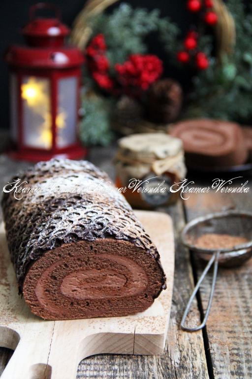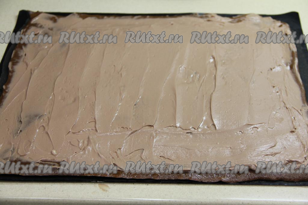 Сливочное масло для приготовления крема должно быть мягким (то есть согревшимся при комнатной температуре), поэтому его нужно предварительно достать из холодильника. Для получения крема нужно соединить мягкое сливочное масло и шоколадную пасту, взбить миксером до однородного состояния. Ещё горячий корж свернуть в рулет вместе с ковриком (или пергаментом) и оставить на 10 минут. Развернуть корж, аккуратно удалить коврик (или пергамент). Смазать корж сверху кремом, немного отступив от краёв.