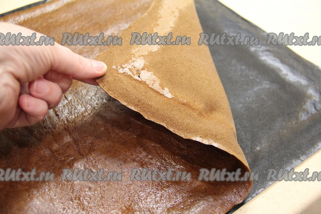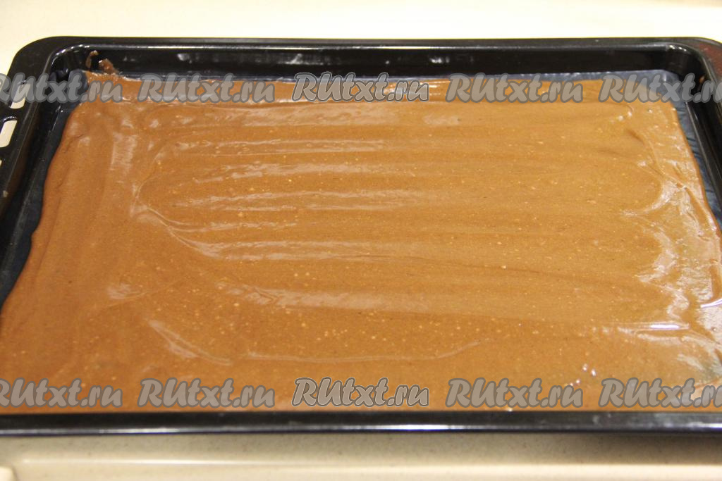 Противень застелить тефлоновым ковриком (или пергаментом). У меня противень размером 30 сантиметров на 45 сантиметров. Выложить тесто на застеленный противень и равномерно распределить, сформировав прямоугольный корж.