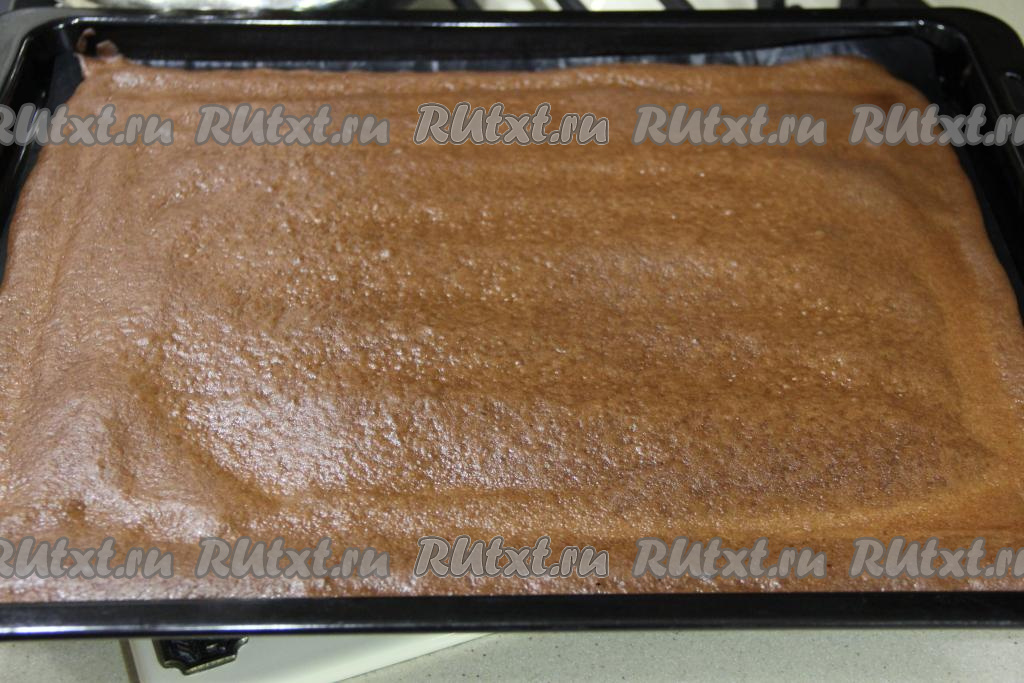 Выпекать бисквит в разогретой духовке минут 15 при температуре 180 градусов. Не пересушите, готовность можно проверить, проколов бисквит сухой зубочисткой (если зубочистка и после прокола бисквита будет сухой, значит основа нашего рулета полностью готова, сразу доставайте её из духовки).
