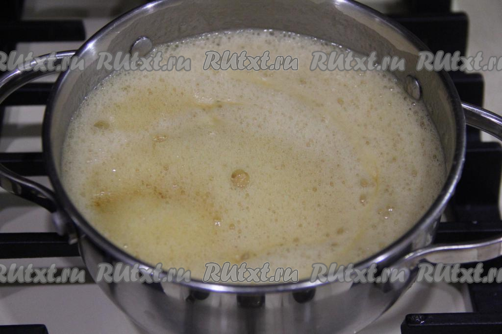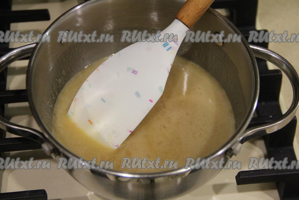 Масса станет пышной и запенится. Варить массу при помешивании на небольшом огне до карамельного цвета (минут 5).