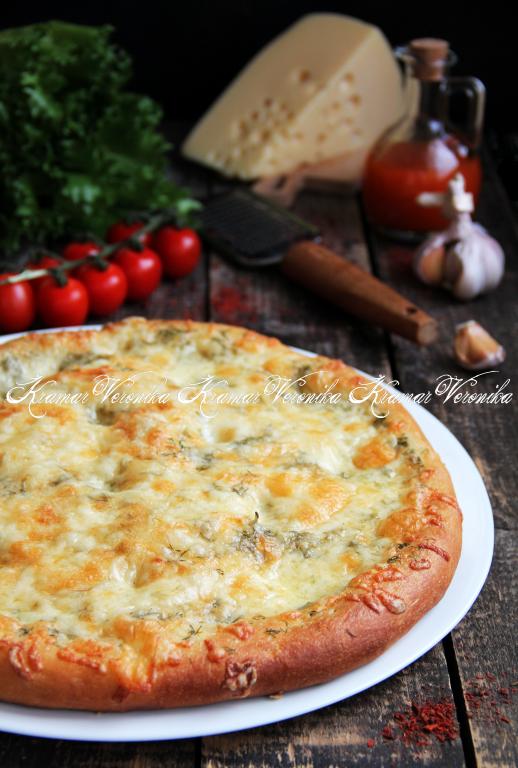 Предлагаю испечь в духовке воздушную, вкусную, достаточно большую сырную лепёшку. Формируется она из дрожжевого теста. Сверху смазывается смесью сливочного масла, чеснока и зелени, а затем посыпается сыром. В результате мякиш хорошо пропитывается и лепёшка получается очень вкусной. Такую пышную, аппетитную лепёшку можно подать к супу, мясу или рыбе.