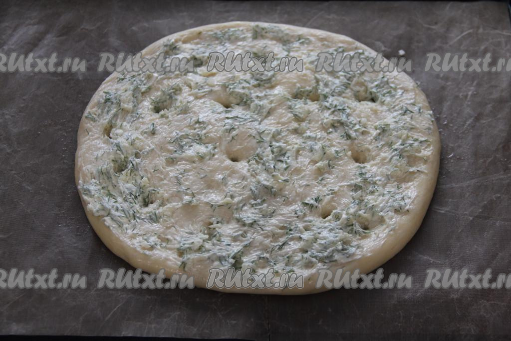 Смазать лепёшку чесночно-масляной массой. Пальцем сделать углубления в тесте по всей поверхности лепёшки.