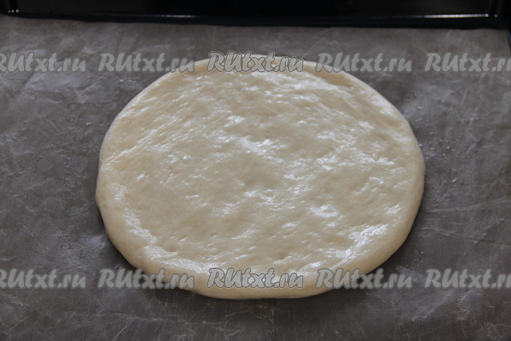 Застелить противень пергаментом (или ковриком для выпечки). Руки смазать растительным маслом, тесто обмять, переложить на противень и распределить руками в круглую лепёшку диаметром 28 сантиметров.