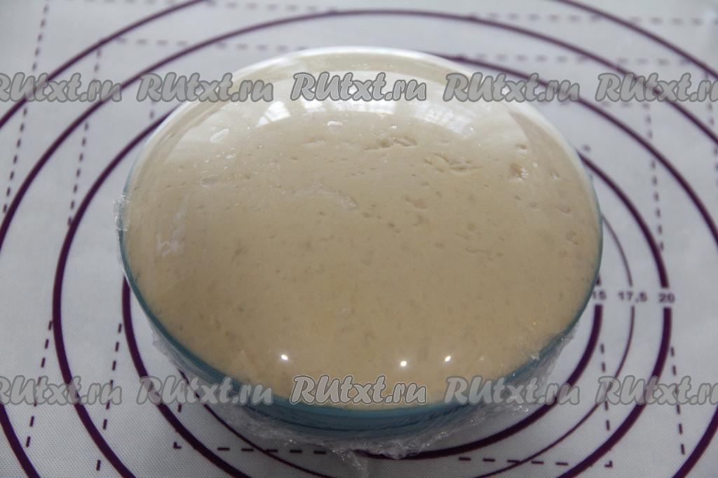 Вымесить тесто руками до гладкого состояния. Сформировать колобок из теста и оставить его в миске, накрыв пищевой плёнкой. Поставить миску с тестом в тёплое место на минут 45.