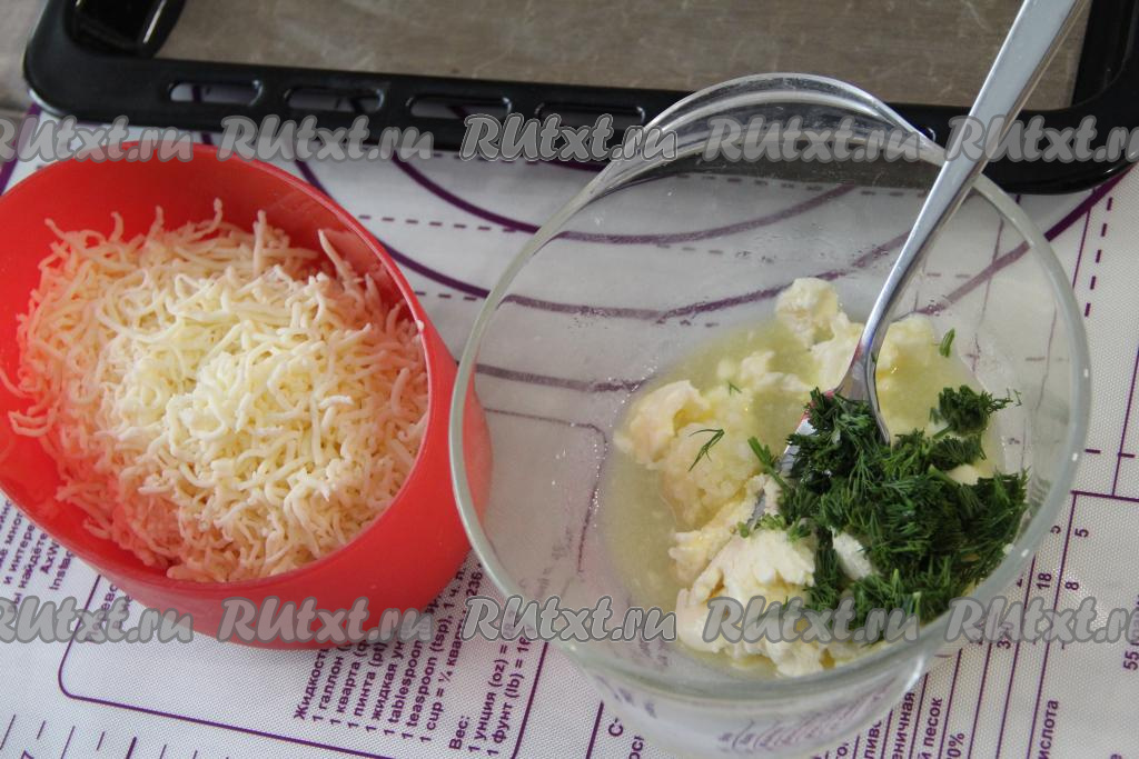 Оставить лепёшку в тёплом месте минут на 20. Для приготовления начинки нужно в небольшой ёмкости соединить мягкое сливочное масло (чтобы масло стало мягким, заранее достаньте его из холодильника, постепенно оно согреется и размягчится), мелко нарезанный укроп и пропущенный через пресс чеснок, перемешать чесночно-масляную массу до однородности с помощью вилки. Сыр натереть на мелкой тёрке.