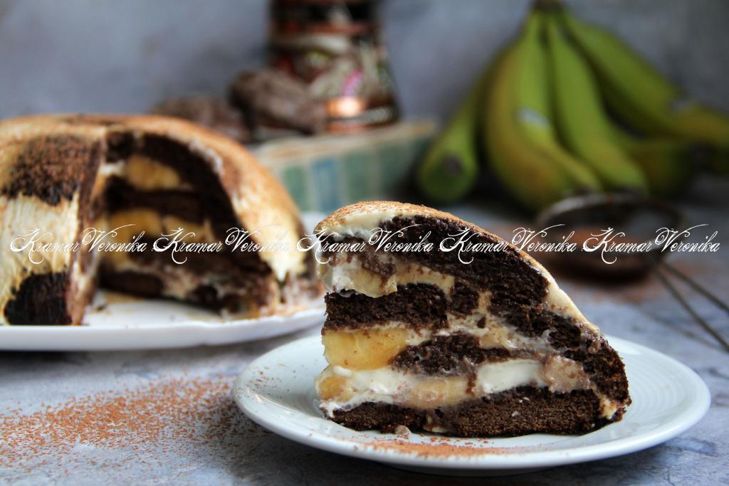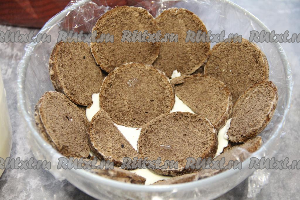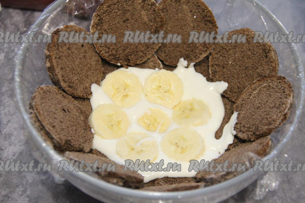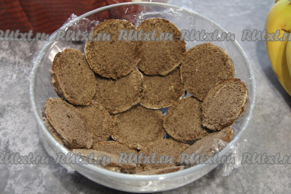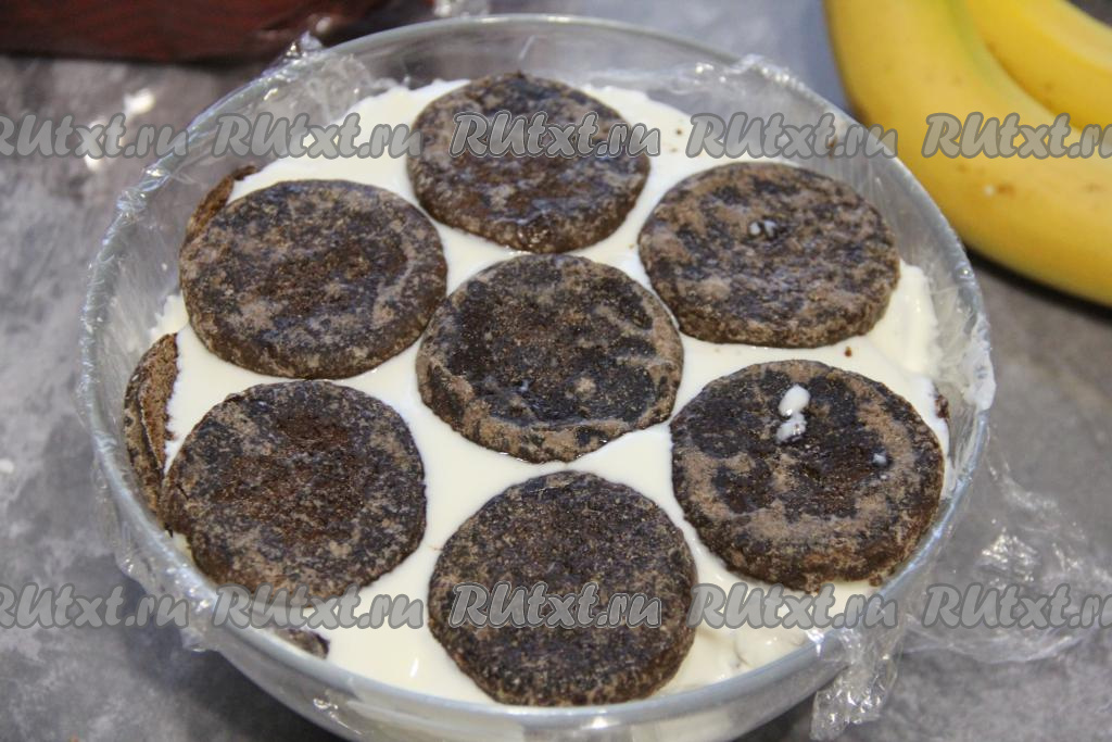 Далее, выкладывая слоями и чередуя крем, бананы и пряники, собрать торт (верхним слоем должны быть пряники).