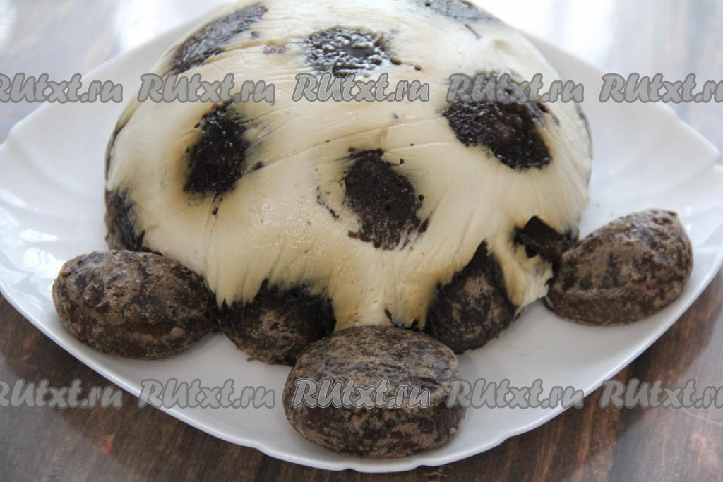 На следующий день освободить верх торта от плёнки и перевернуть тортик на плоскую тарелку. Теперь осталось украсить его. Один отложенный пряник положить в качестве головы черепахи. Второй пряник разрезать поперёк пополам и выложить две передние лапки.