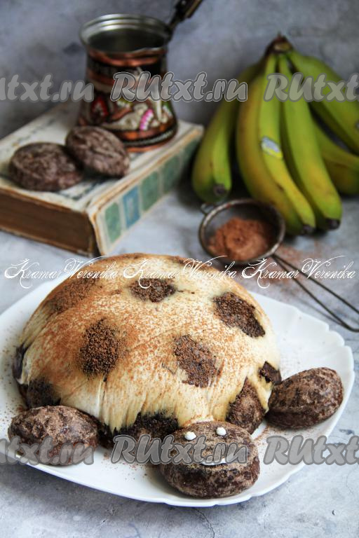 Слегка присыпать торт какао или можно растопить шоколад и нарисовать кружочки, как панцирь у черепахи. Сделать глазки и ротик из остатков сметанного крема. Вот такой торт "Черепаха" из пряников и бананов получился у меня.