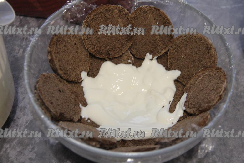 Накрыть торт свисающими краями пищевой плёнкой, слегка прижать сверху все слои. Убрать миску с тортом "Черепаха" в холодильник на ночь. Немного оставшегося сметанного крема уберите в холодильник, для того чтобы на следующий день нарисовать рот и глазки черепашки.