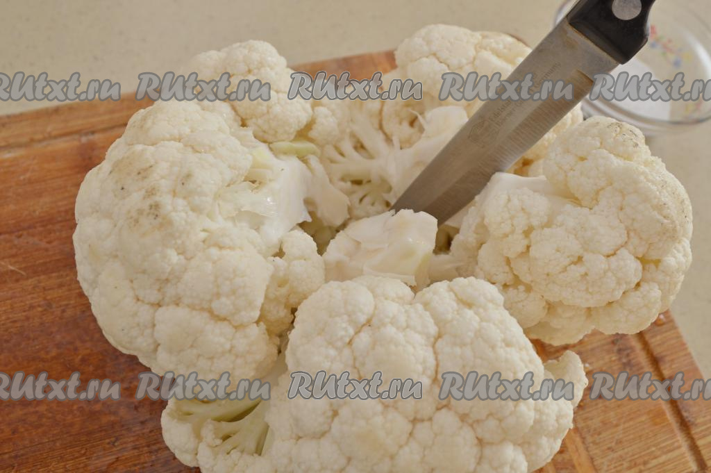 Кочан цветной капусты разделить на примерно одинаковые соцветия (удобно разделять капусту на соцветия, разрезая её ножом со стороны плодоножки).