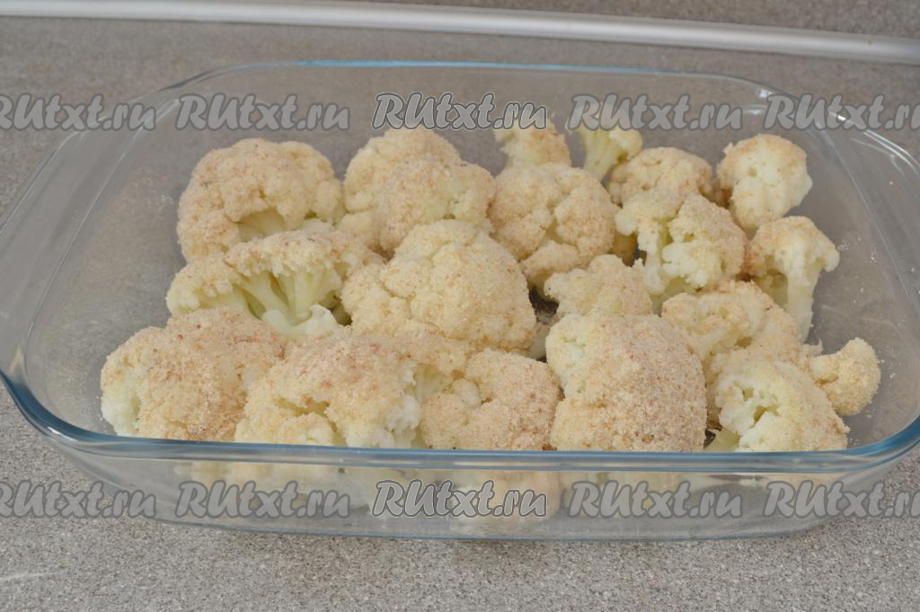 Выложить цветную капусту, покрытую сухарями, в один слой в форму пригодную для запекания в духовке. Маслом форму можно не смазывать. И отправить запекаться в разогретую духовку на 15 минут (до аппетитной, золотистой корочки) при температуре 180 градусов.
