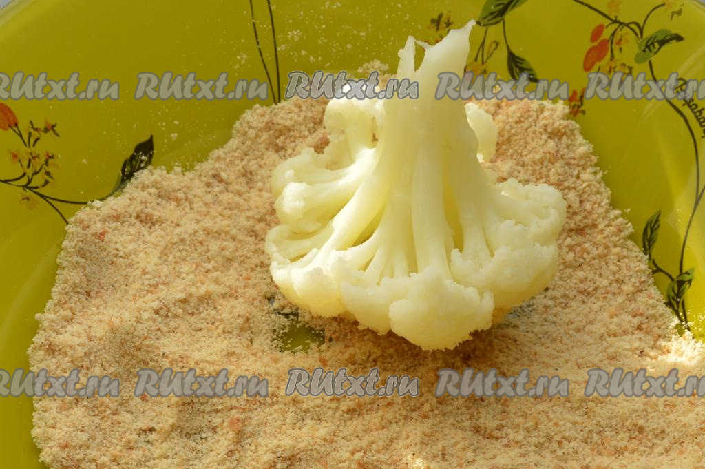 Панировочные сухари насыпать в тарелку. Обвалять каждое соцветие капусты в сухарях.